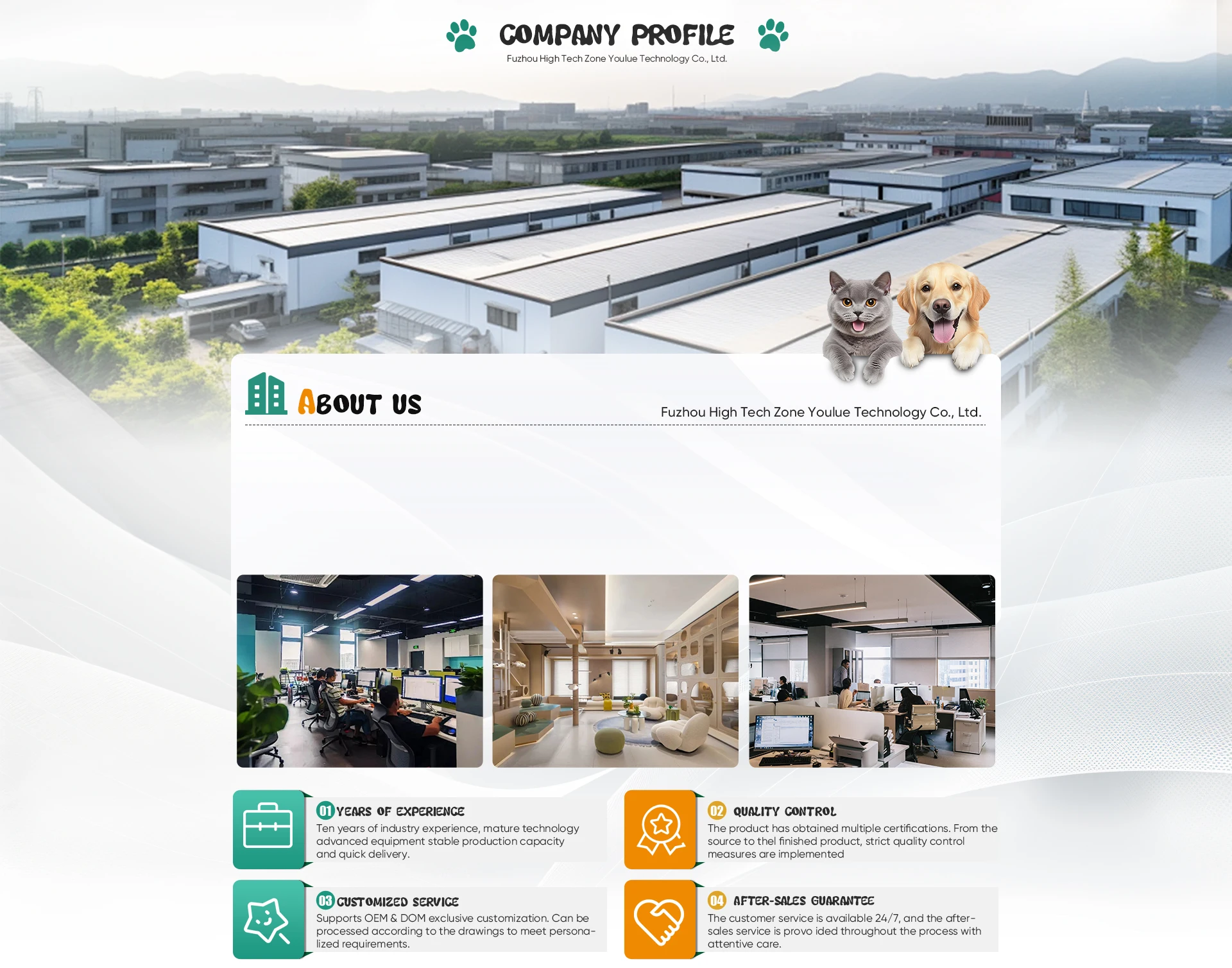 Fuzhou Youlve Technology Co., Ltd. was founded in 2018 and is located in Fuzhou, Fujian. Covering a factory area of over 5,000 square meters with a team of more than 100 staff, it is a pet products enterprise integrating design, R&D, production and sales, with main products including cat trees, pet toys, smart feeders, etc. Since its establishment, the company has quickly expanded into domestic and international markets. Its products are exported to Europe, America, Japan, South Korea, Southeast Asia and other countries and regions, and it has in-depth cooperation with many large and medium-sized pet e-commerce companies in China. Adhering to the tenet of "Every product brings warmth to pets", we strive to provide new and old customers with high-quality, cost-effective products and timely delivery services. We welcome friends from all countries to exchange ideas, cooperate and seek common development.